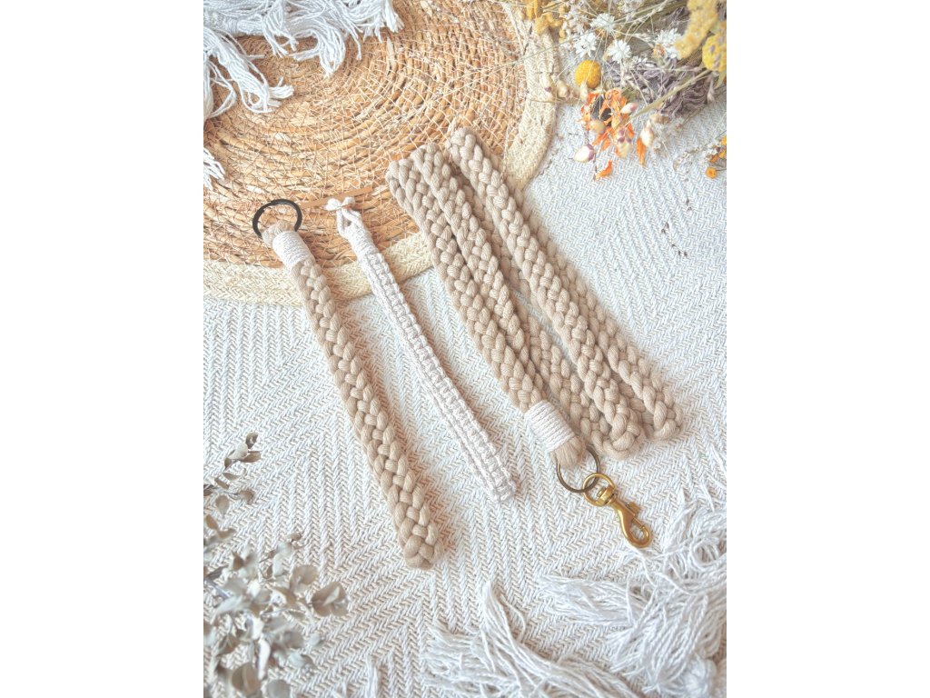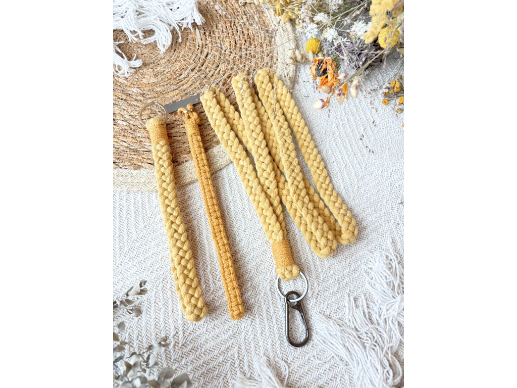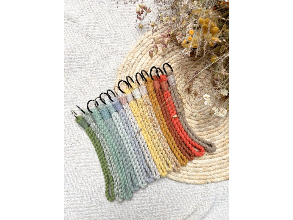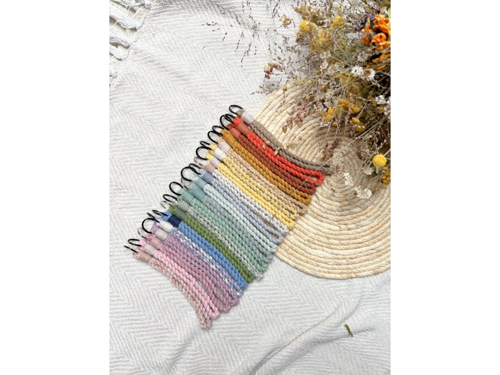 Klíčenka ve tvaru poutka, někdy nazývaná wristlet (wristlerka), je praktická macramé vychytávka pro každodenní nošení. Navléknete ji na zápěstí a klíče, čip od dveří nebo malou peněženku tak máte bezpečně u sebe – ideální, když máte plné ruce nebo nechcete lovit klíče na dně kabelky.