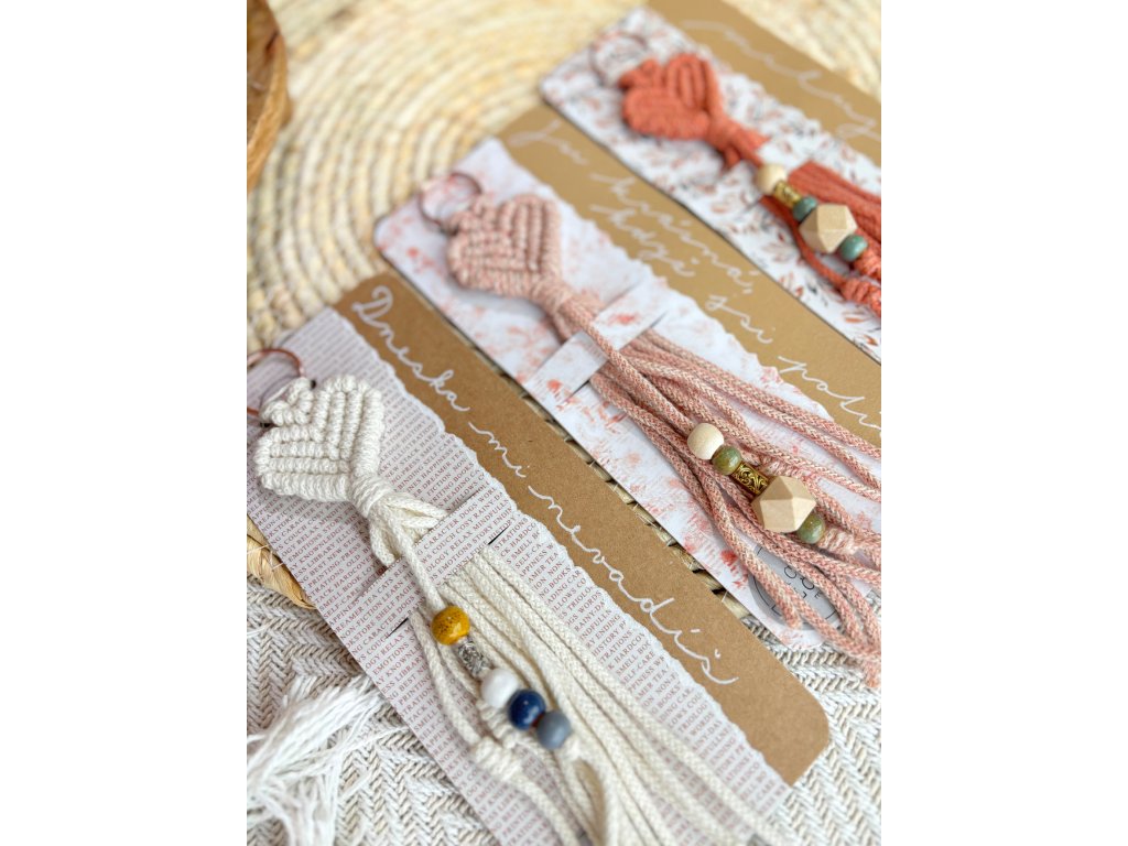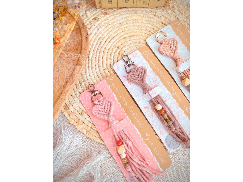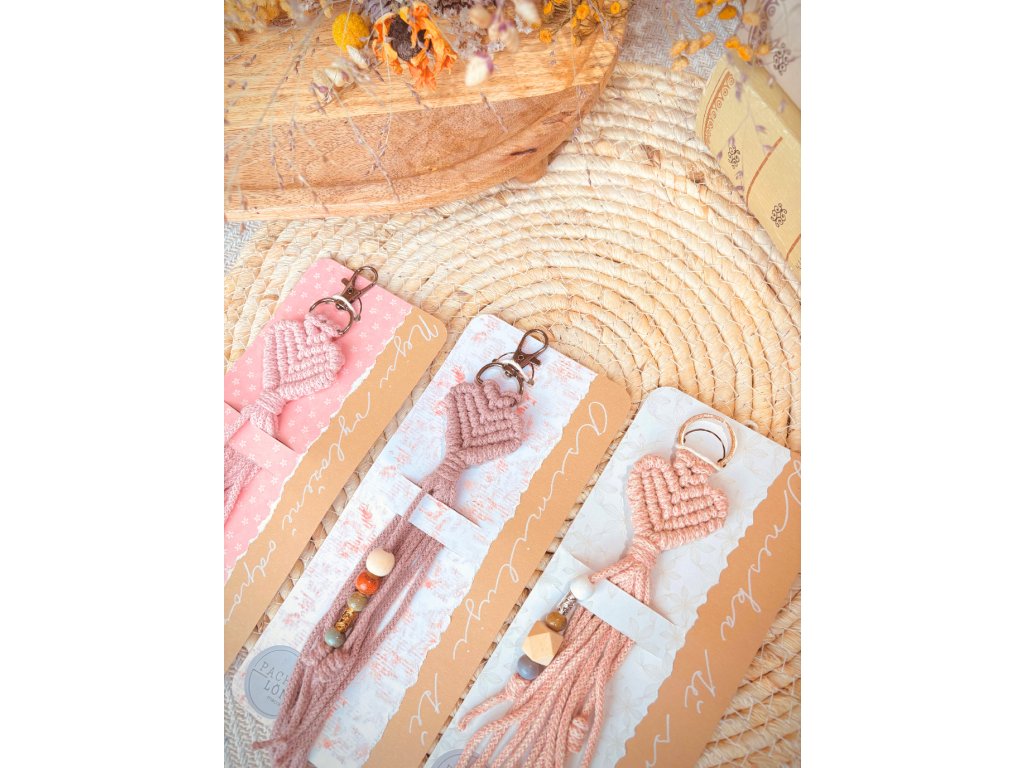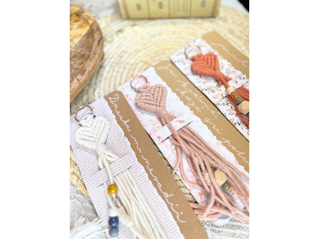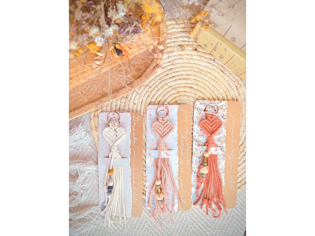 Macramé klíčenka ve tvaru srdíčka – i beze slov lze vyjádřit hluboký cit! Ručně vázané srdíčko, které zjemní klíče i kabelku a udělá radost. Papírové přáníčko řekne vše za vás.