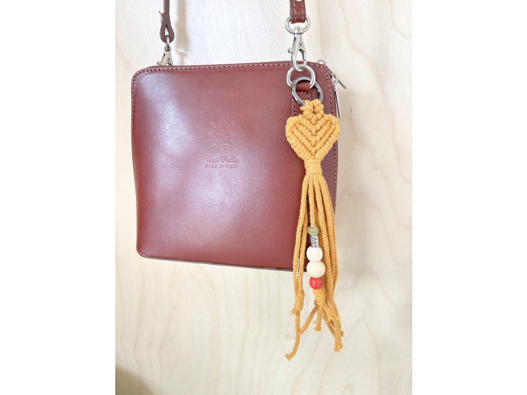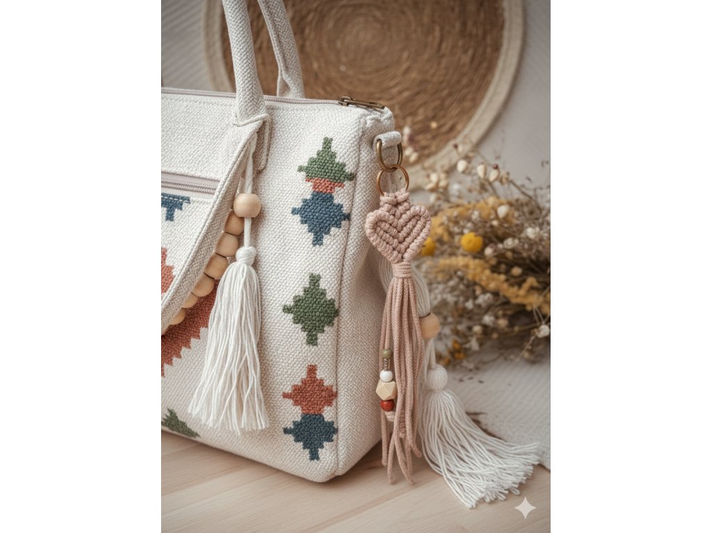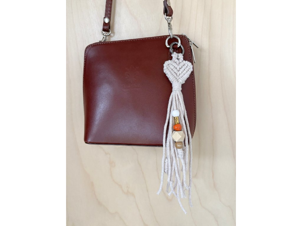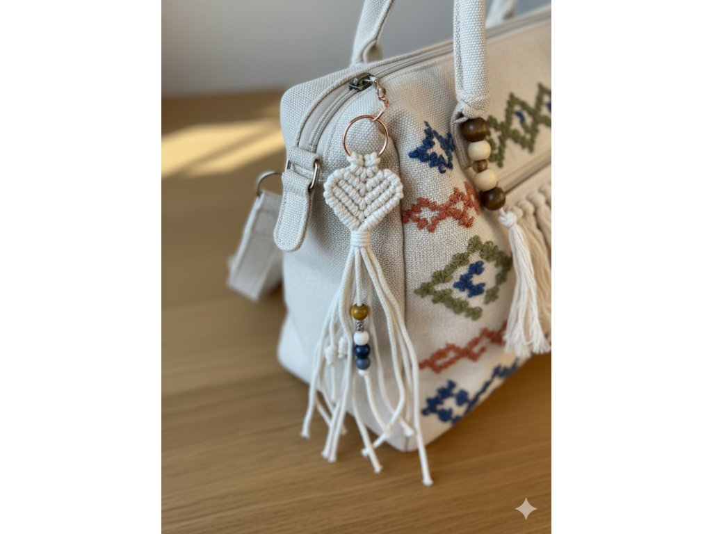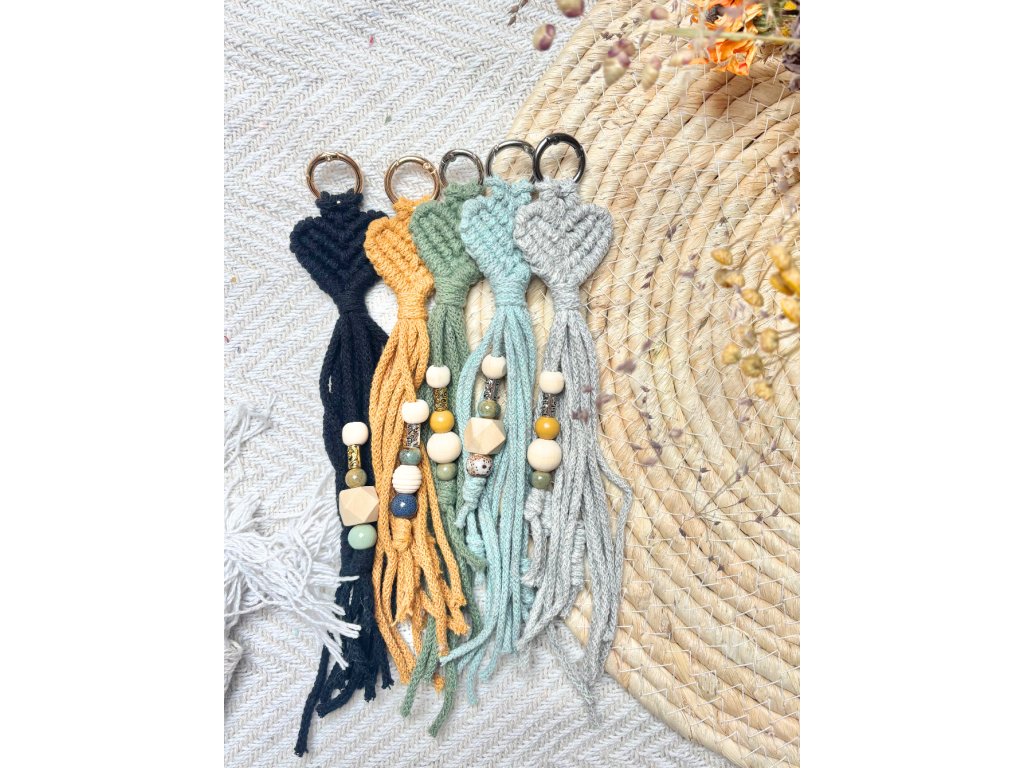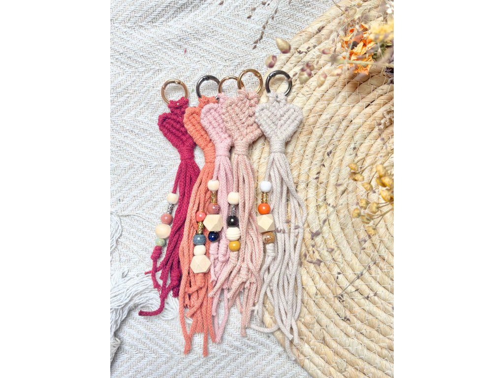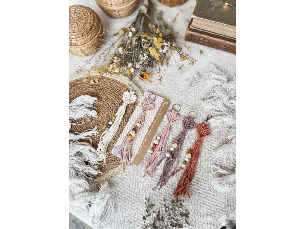 Ručně vyráběná macramé klíčenka ve tvaru srdíčka je malý detail, který udělá velkou parádu – hodí se na klíče, batoh, kabelku i jako přívěsek na zip. Jemný uzel působí romanticky i minimalisticky zároveň a díky kovovému kroužku se klíčenka snadno připne a dobře drží. Cácorky jsou doplněné o korálky a uzlíky, aby si vaše nezbedné prstíky měly s čím hrát.